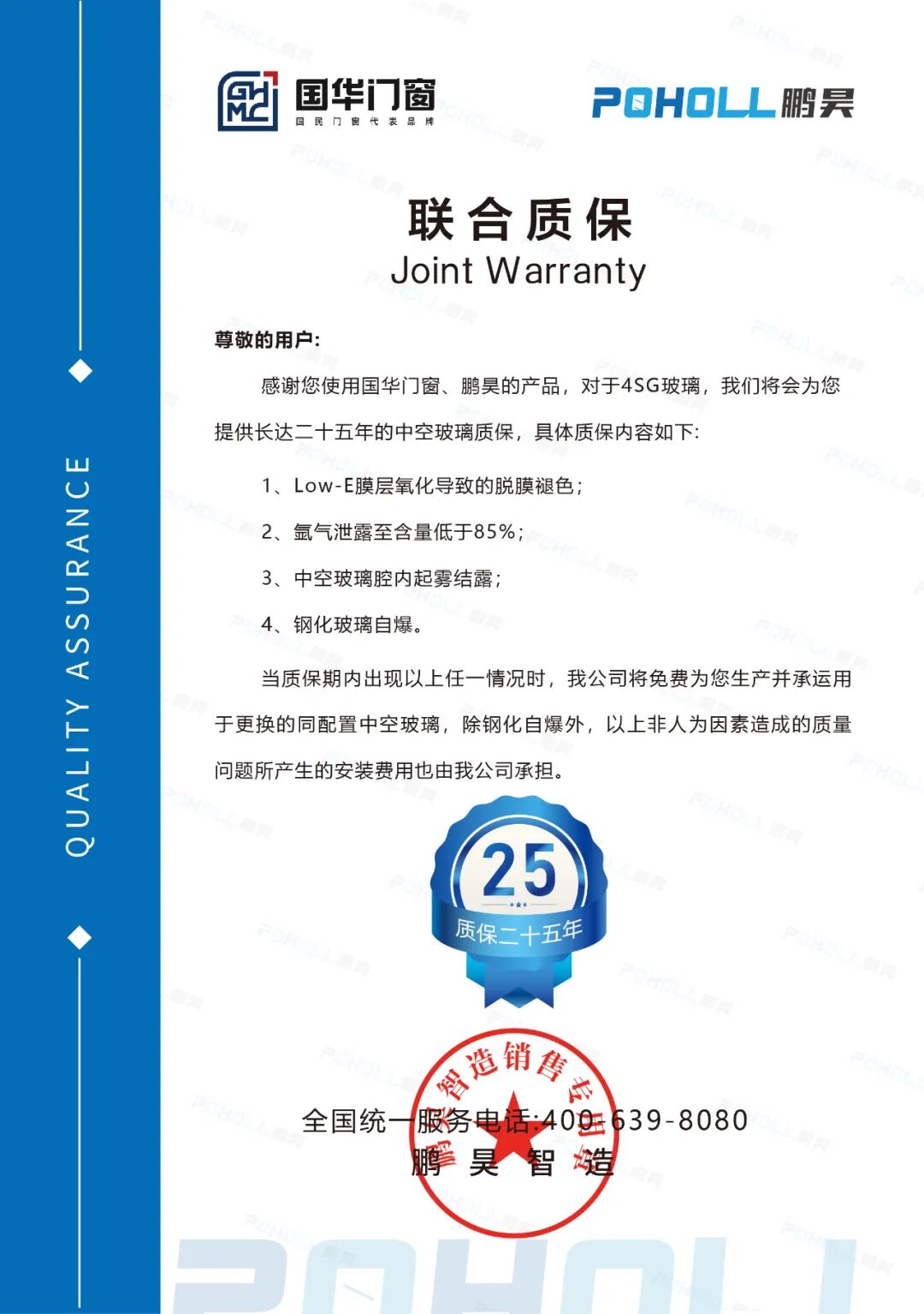 మరింత ముఖ్యంగా, Guohua డోర్స్ & Windows మరియు Penghao సంయుక్తంగా పొడిగించిన వారంటీని ప్రారంభించాయి, 4SG గ్లాస్కు ఇన్సులేటింగ్ గ్లాస్పై 25 సంవత్సరాల వారంటీని అందిస్తుంది. ఈ నిబద్ధత లో-E ఫిల్మ్ యొక్క ఆక్సీకరణ వలన డీలామినేషన్ మరియు రంగు మారడం, 85% కంటే తక్కువకు ఆర్గాన్ గ్యాస్ లీకేజ్, ఇన్సులేటింగ్ గ్లాస్ కేవిటీలో ఫాగింగ్ మరియు కండెన్సేషన్ మరియు టెంపర్డ్ గ్లాస్ స్పాంటేనియస్ పేలుడు వంటి అనేక కీలక సమస్యలను కవర్ చేస్తుంది. ఇటువంటి సమగ్రమైన మరియు దీర్ఘకాలిక వారంటీ పరిశ్రమలో చాలా అరుదు మరియు ఉత్పత్తి నాణ్యతపై రెండు పార్టీల విశ్వాసాన్ని మరియు కస్టమర్లకు వారి లోతైన నిబద్ధతను పూర్తిగా ప్రదర్శిస్తుంది.